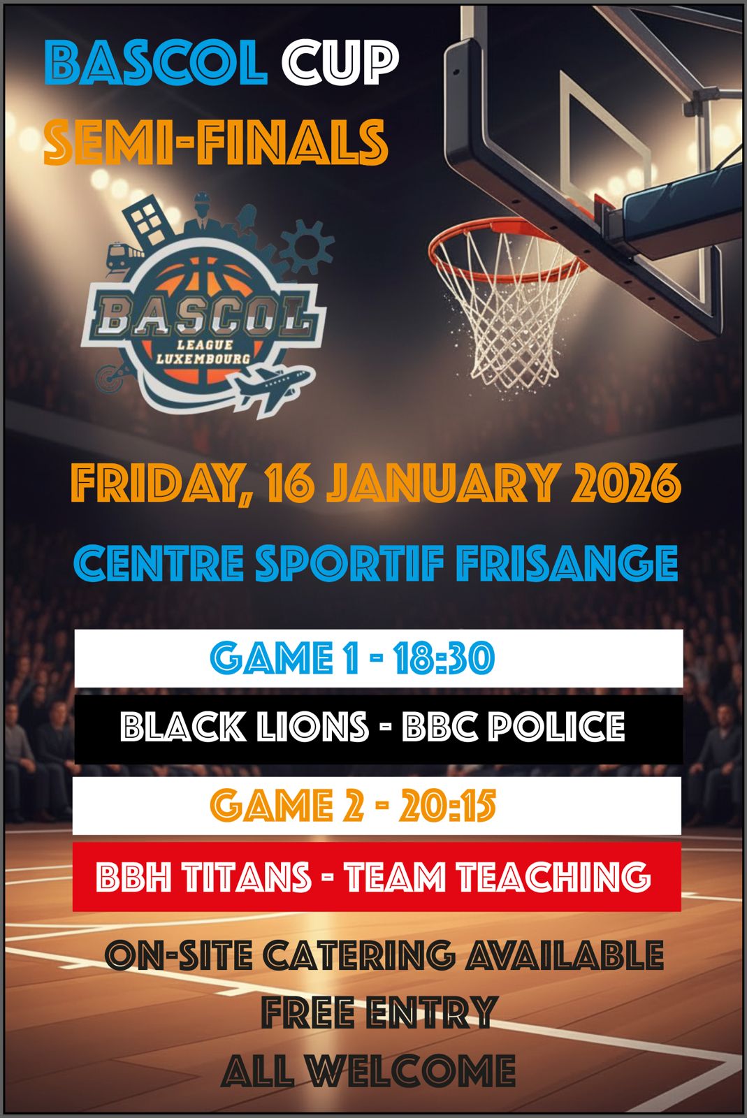 Am Kader vum BASCOL – Basket Corporatif Luxembourgeois spillt eis Ekipp nächste Freiden, de 16. Januar 2026 um 18:30 Auer zu Fréiseng, d’Halleffinall vun der Coupe géint d’BLACK LIONS aus Diddeleng, den aktuelle Leader am Championnat.